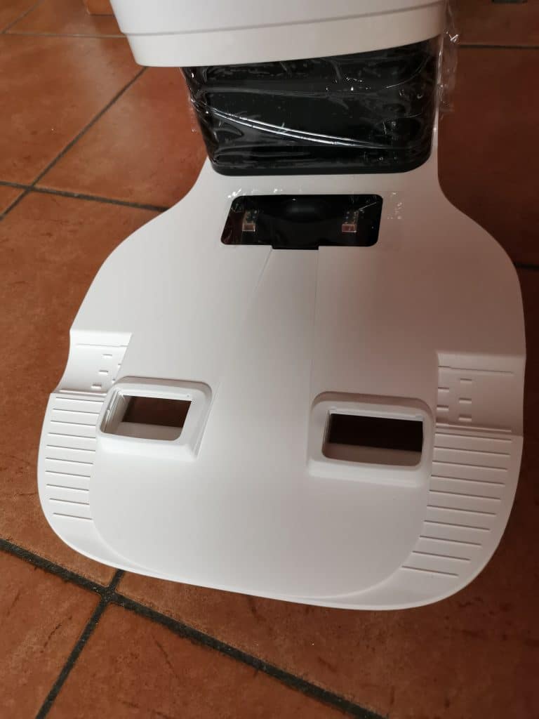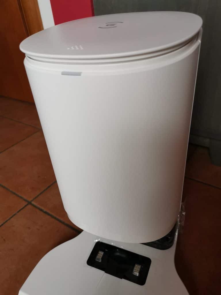 Con la classica stazione di ricarica, che il robot raggiunge in automatico quando la batteria è scarica, viene integrata anche la base di svuotamento a forma cilindrica sempre in bianco totale.