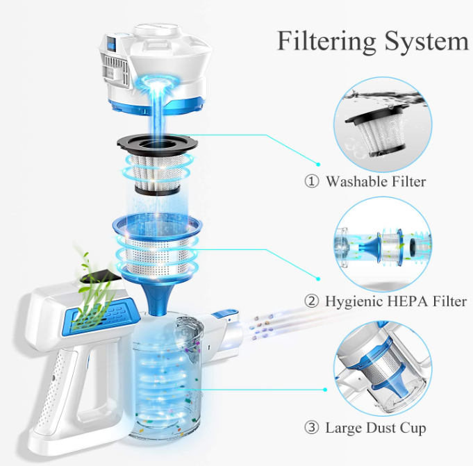 La tecnologia usata dall’aspirapolvere è di tipo ciclonico, quindi senza usare alcun sacchetto, intrappoliamo e tratteniamo anche la polvere più fina, grazie al filtro HEPA.